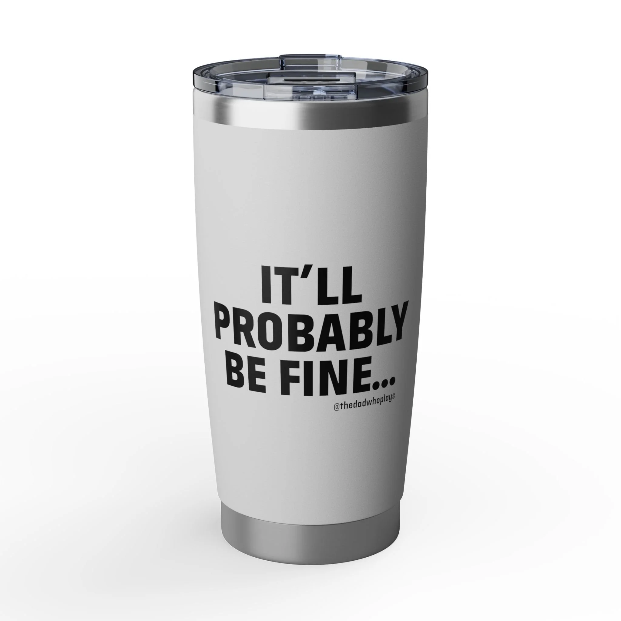 This 20oz stainless steel tumbler carries a wry, quiet confidence — an everyday companion that keeps your coffee hot and your iced drinks crisp while you move through a busy day. The matte white body and bold, black lettering read like a small, consoling whisper: “It’ll probably be fine…” It’s the kind of thing you reach for during early morning commutes, last-minute road trips, or slow afternoons at a cluttered desk. The spill-resistant sliding lid with rubber gasket makes it forgiving in a bag or cup holder, while the double-wall insulation wards off sweat and keeps temperatures steady. Lightweight, sturdy, and printed with vibrant, long-lasting ink, it feels simultaneously practical and lightly ironic — a low-key statement piece for people who prefer humor over fanfare.
